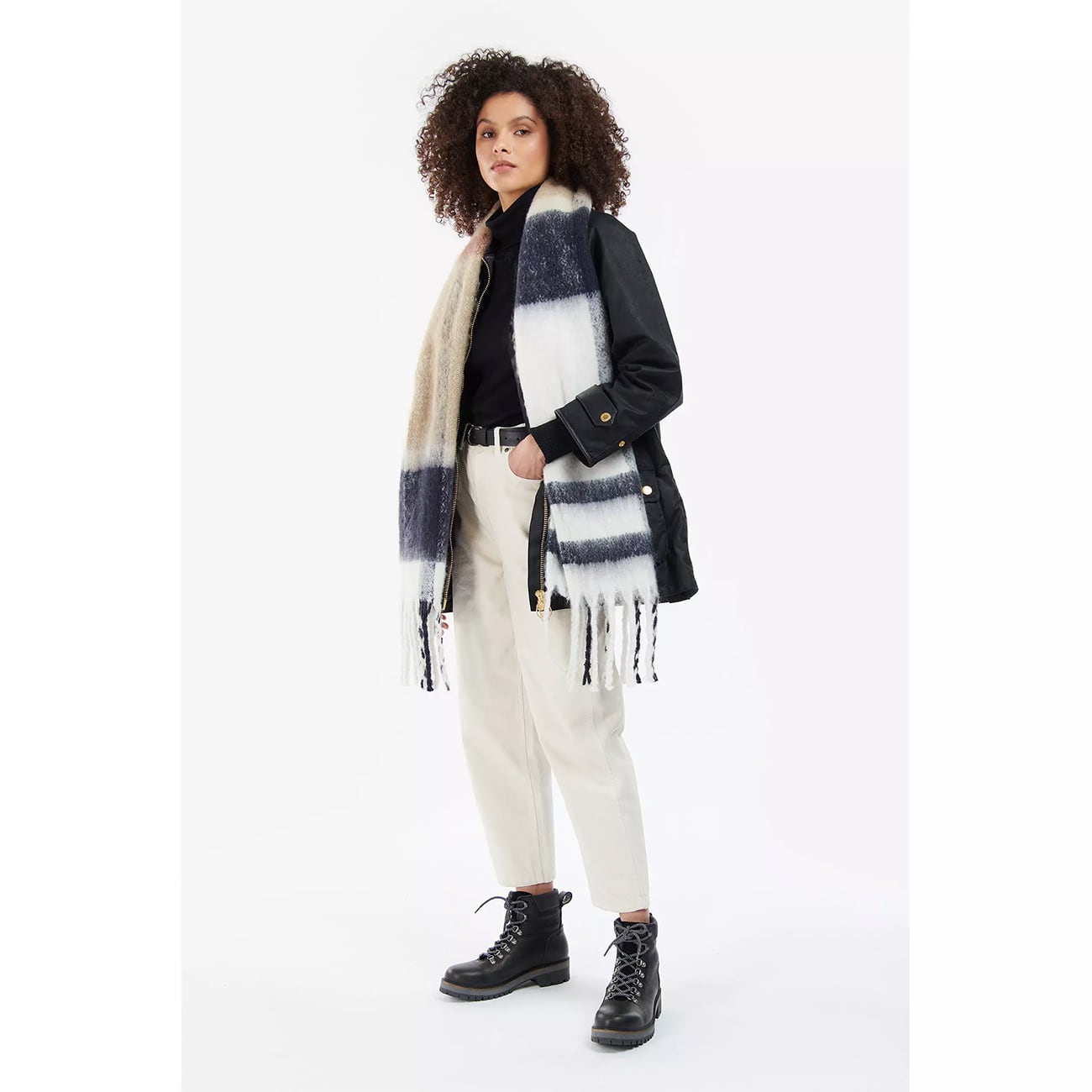 バブアーの「Isla Tartan Boucle Scarf」は、極上の柔らかさで、寒い季節の重ね着に最適です。