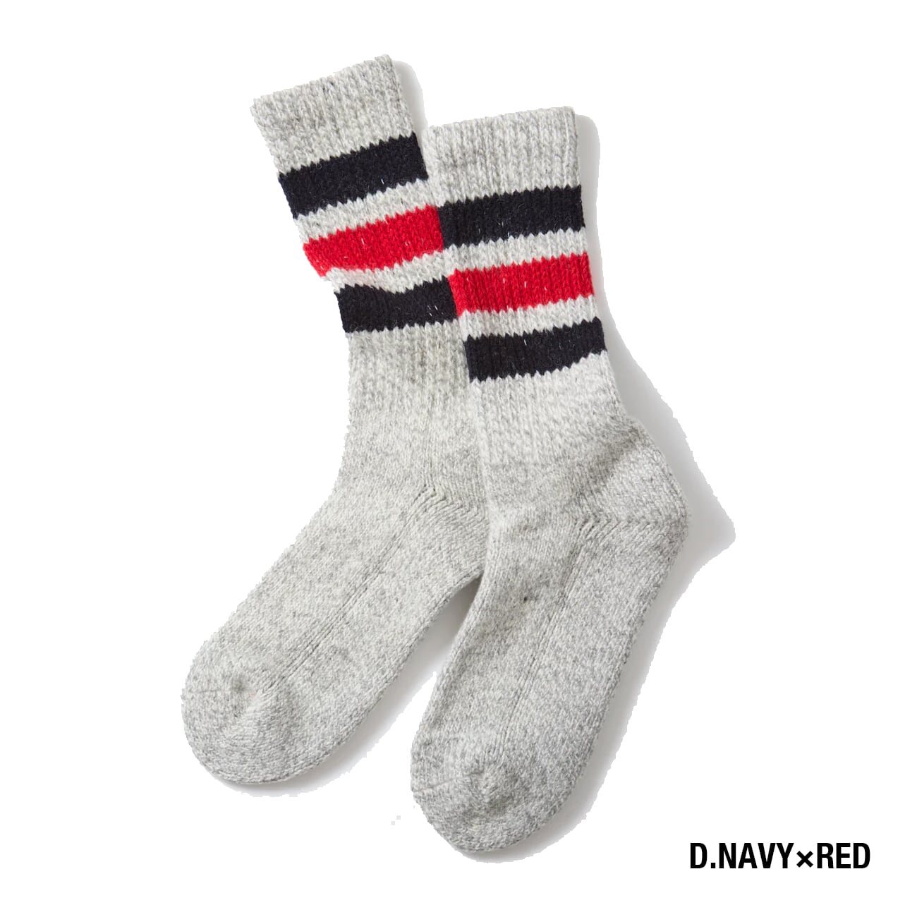 ワークブーツソックスのスペックをベースに、レトロなチューブソックスのストライプデザインを掛け合わせた一足。ブーツの履き口からストライプがちらりと見えるよう、やや高めの位置にラインを配置しています。足底はクッション性のあるパイル編みで、長時間のブーツ着用による疲れを軽減してくれます。