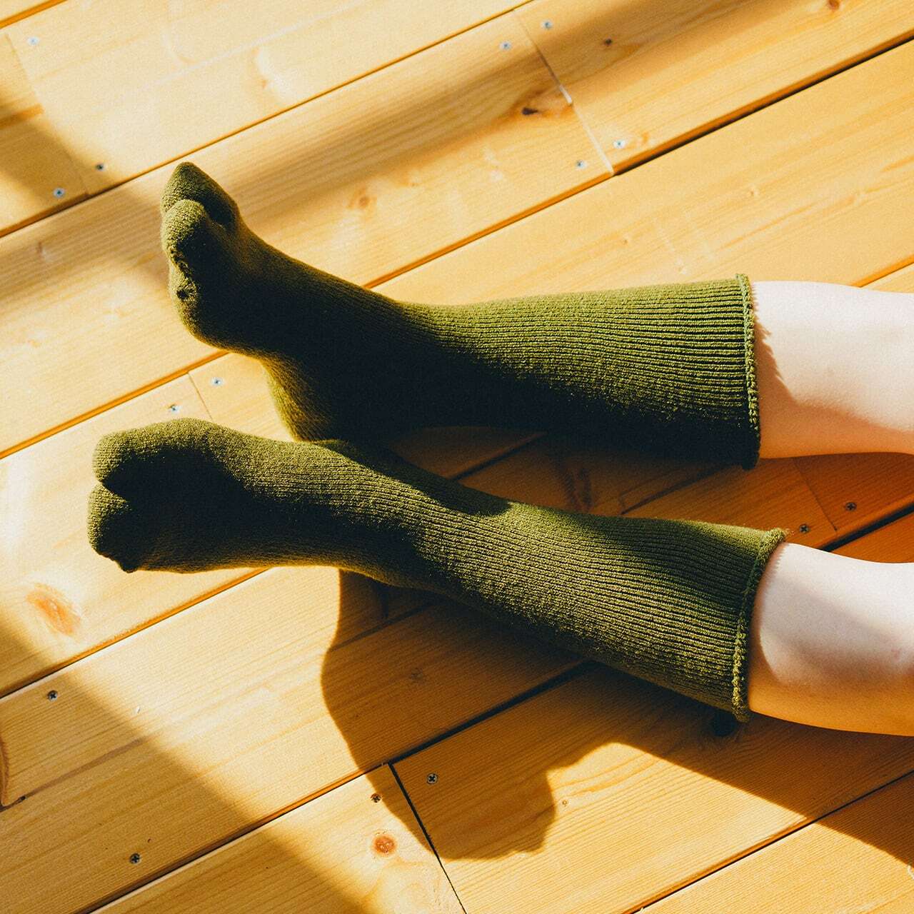 内側全体をパイル編みし、特殊な機械で2回起毛。通常の1回起毛に比べ毛羽が立ち、空気を含みやすくなることで高い保温性と防寒性を実現しました。 ルームソックスとしてはもちろん、サンダルと合わせてアウトドアやタウンユースにも活躍。寒い冬のリラックスタイムやデイリーユースに欠かせない、上質で機能的な一足です。