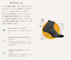 「メリノの概念を覆す、かつてない履き心地」 Feetures独自の「Merino 10」は、最高級メリノウールとTENCEL®(テンセル)繊維を独自の技術で混紡。200針のハイカウント編み機で製造され、従来のウールソックスよりも遥かに柔らかく、ストレッチ性、耐久性、速乾性に優れた次世代のパフォーマンスソックスです。