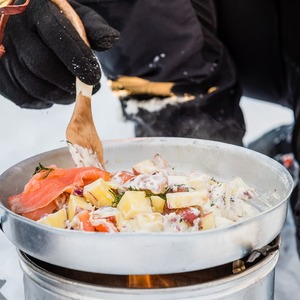 ・湯切りやまな板として便利なマルチディスクはストームクッカーの雪上用のベースプレートとしても使用できます。マルチディスクはフライパンの内側に収納可能です。