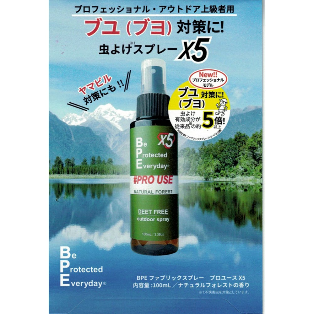 2018年BPE虫よけスプレー発売以来、 ブヨに効きますか?そんなお声もたくさんいただきました。そこで満を持して出来たのが、 ブヨ対策に有効な成分を当社従来品よりも約5倍以上増量した プロユースX5 。