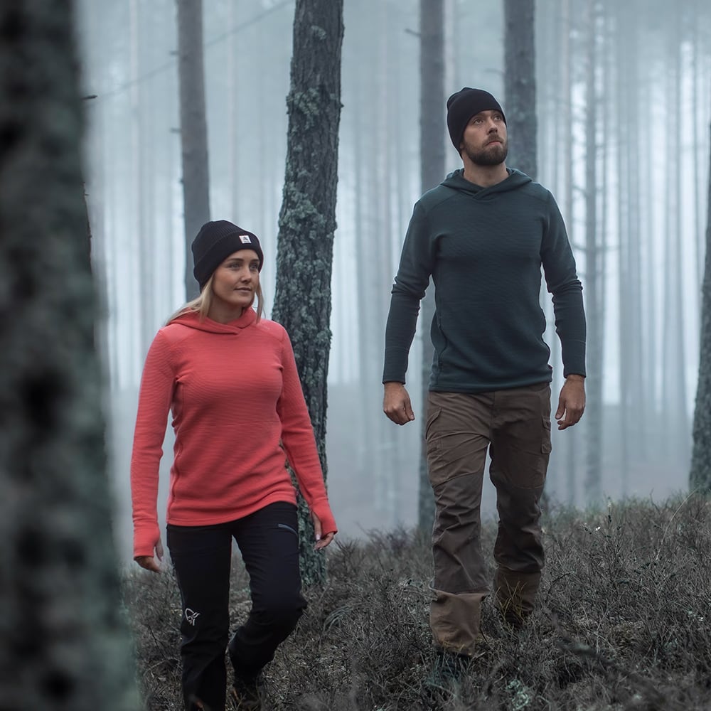 ストリームフーディは、フードと腹部の前面にジッパー付きポケットが付いているウールのセーターです。