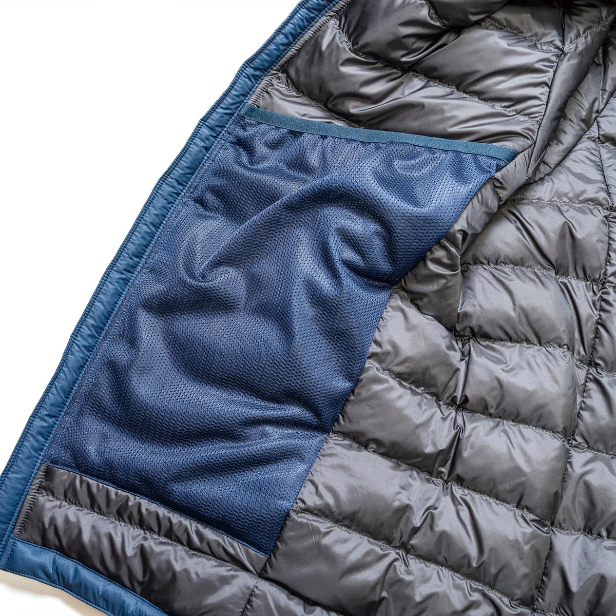 - 素材: <シェル>表10Dリサイクルナイロン100%(C0超超撥水), 内側20Dリサイクルナイロン100%(C0撥水), <中わた>AIR FLAKE 850FP(リサイクルポリエステル100%)