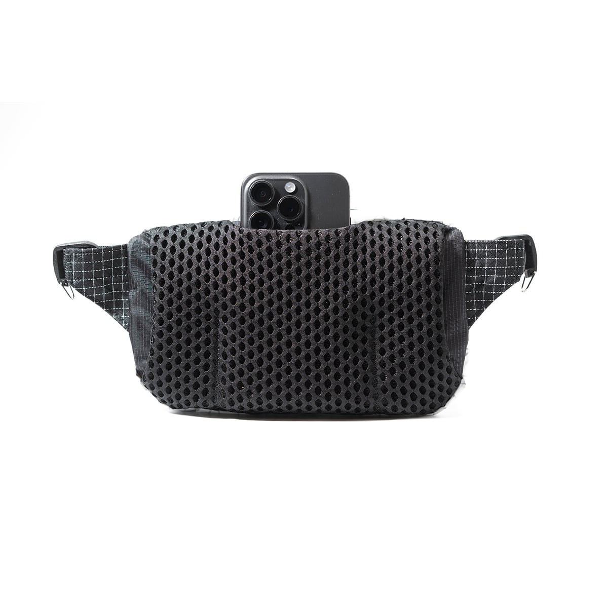バックパックの背面と同じく、通気性とクッション性のあるダブルラッセルメッシュを採用しています。上部からスマートフォンを入れられるポケットがあります。